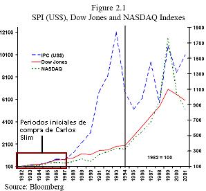 La siguiente gráfica muestra el crecimiento (en dólares) del IPC desde 1982 hasta el 2001. Al inicio de la gráfica está el periodo durante el cual Carlos Slim inteligentemente comienza sus inversiones. El crash del año 1987 no marca una señal de venta porque, una vez más, aplicando sentido común, los precios de las acciones estaban por los suelos. Una muestra más de que las enormes caidas causadas por pánico e ignorancia pueden significar una verdadera oportunidad de inversión, para aquellos pescadores que tienen valor, paciencia y visión.