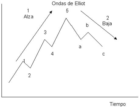 | Básicamente, la teoría de Elliot dice que los mercados siguen un patrón que siempre se repite. Según Elliot, los mercados suben en avances de cinco ondas y continúan con correcciones de descanso de tres ondas. Los movimientos alcistas 1, 3 y 5 son denominadas, según Elliot, ondas de impulso. Los movimientos bajistas 2 y 4 son denominados ondas correctivas. Una vez finalizado el movimiento alcista con sus 5 ondas (tres de impulso y dos correctivas), empieza una corrección de todo el movimiento que se produce en tres ondas, a, b y c.A su vez, cada onda de Elliot puede subdividirse en un ciclo completo, es decir, la primera onda puede estar compuesta por tres ondas de impulso y dos correctivas, y así sucesivamente. La regla primordial de Elliot es que nunca puede haber una corrección de cinco ondas. Su teoría dice que en un mercado alcista, un descenso que se compone de 5 ondas significa que se esta iniciando una corrección. Es decir, se esta formando la primera onda correctiva a, las cuales vendrán seguidas de la alcista b y la correctiva c, lo que significa que el mercado continuara sus descensos. En cambio, en un mercado bajista, un avance alcista de tres ondas, denota una corrección en forma a, b, c, y por lo tanto, reanudara su tendencia bajista.