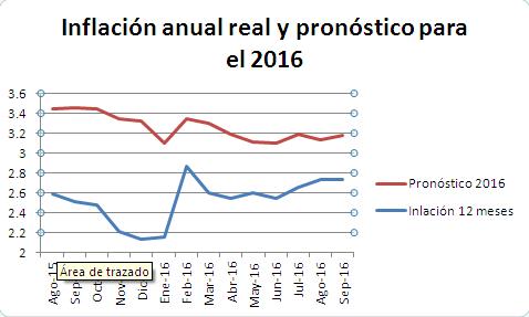![]() El comportamiento de la inflación en el año ha sido al alza después de haber alcanzado un mínimo del 2.13% en diciembre del 2015. A pesar de esta alza, el nivel de inflación anual todavía no llega al pronóstico de los expertos, aunque el aumento en el precio de la gasolina y la devaluación del peso estarían generando presión al alza en la misma.