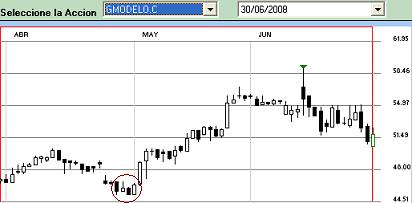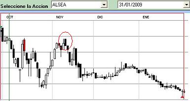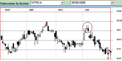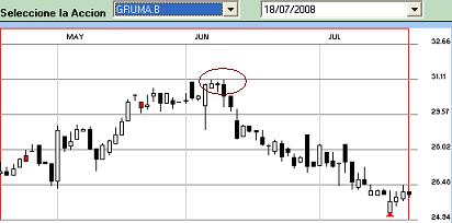 En esta otra gráfica, se observa un tweezer top, donde la primera vela es además una estrella fugaz.